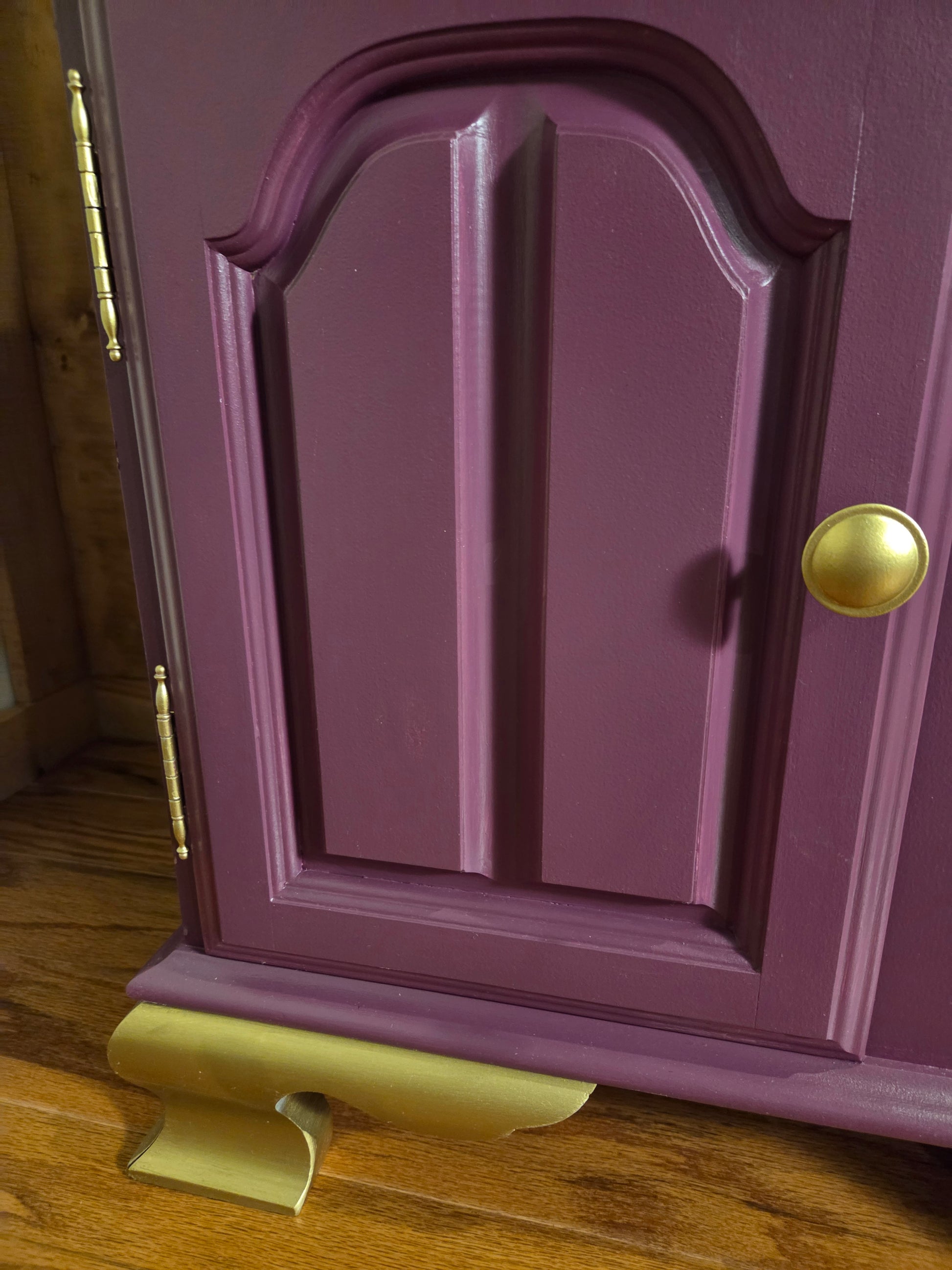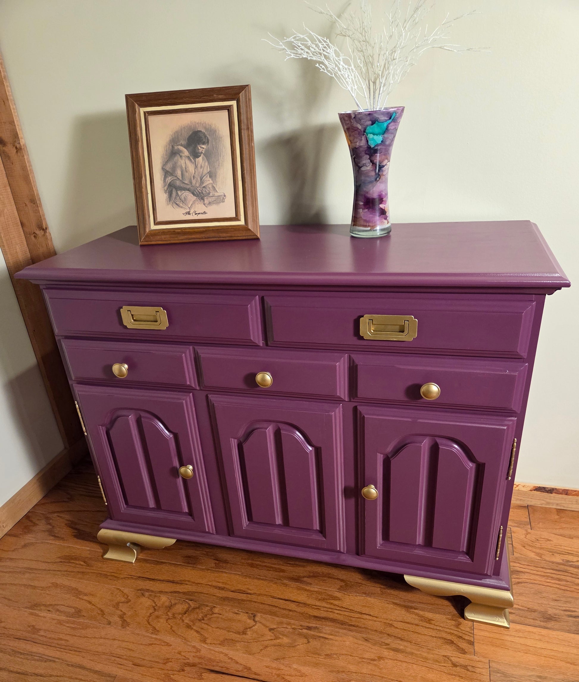 Ooh La La...This royal statement piece is something to behold! Rich royal purple with gold accents and a surprising bright beach blue inside, WOW. Originally the bottom half of a hutch from the 70's. Has three drawers and the bottom has two doors that open to storage and even a shelf on the inside.